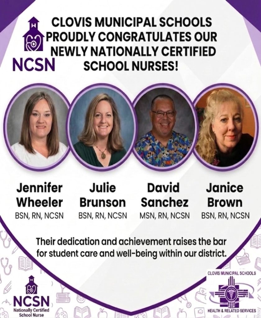 Join us in congratulating Jennifer Wheeler, Julie Brunson, David Sanchez, and Janice Brown on becoming Nationally Certified School Nurses. Their commitment to excellence ensures our students receive the highest level of care. We are proud to have them serving our schools and community. |
