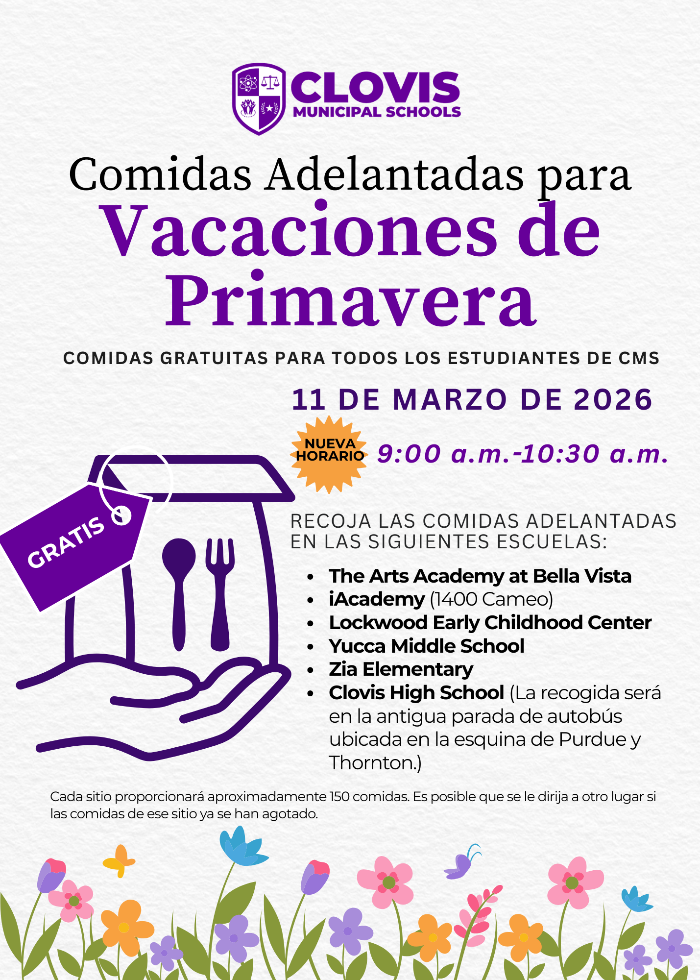 The Student Nutrition Department will provide free Spring Break advance meals for CMS students. Meal pickup will be available on Wednesday, March 11, 2026, from 9:00 AM - 10:30 AM from the following locations: The Arts Academy at Bella Vista, iAcademy (1400 Cameo), Lockwood Early Childhood Center, Yucca Middle School, Zia Elementary, and Clovis High School (at the old bus loop at the corner of Purdue and Thornton). |